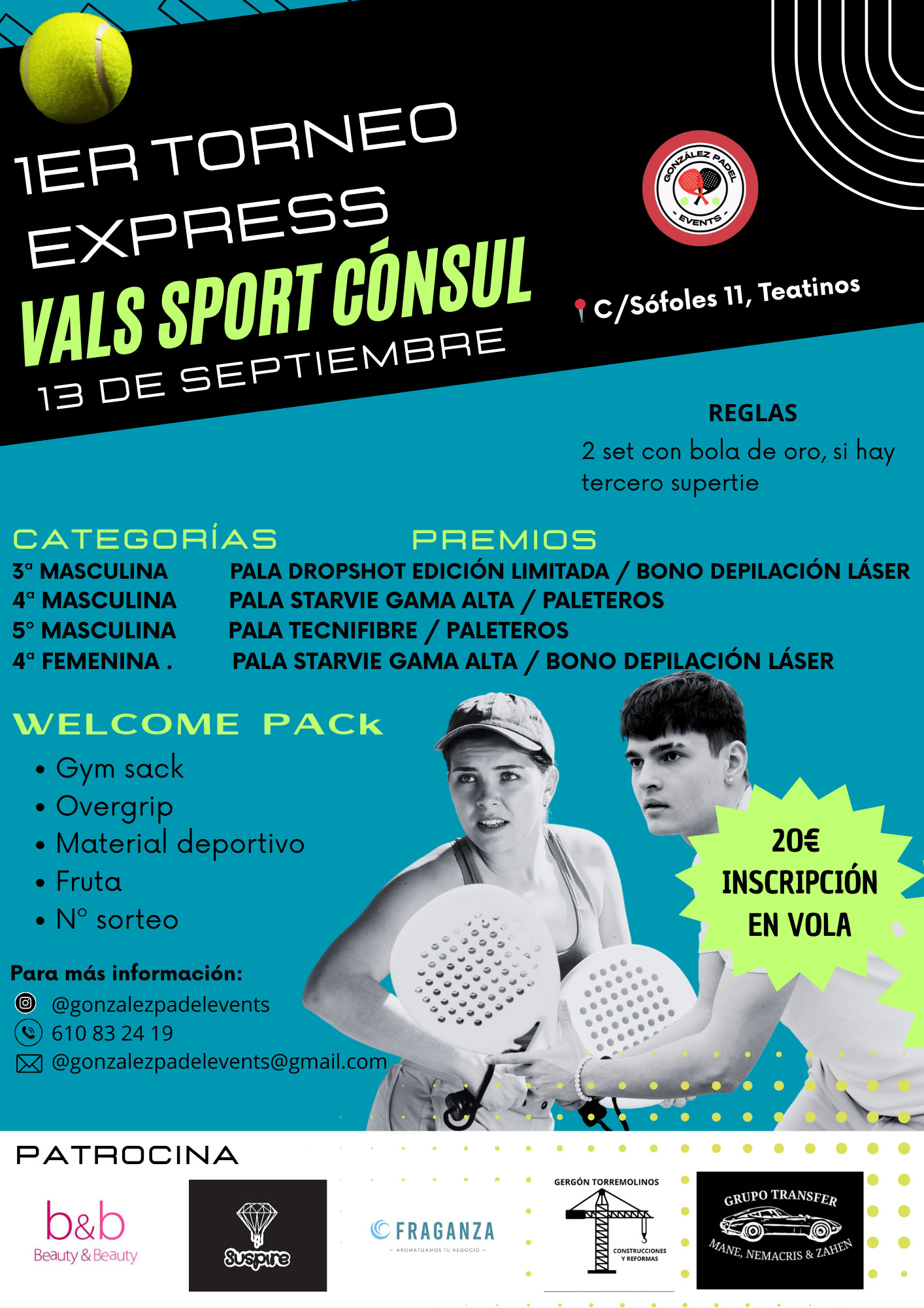 Soy organizador de un torneo amateur con distintas categorias que tendrá lugar los dias 8 y 9 de marzo en Vals sport cónsul. Podeis poneros en contacto conmigo, gracias